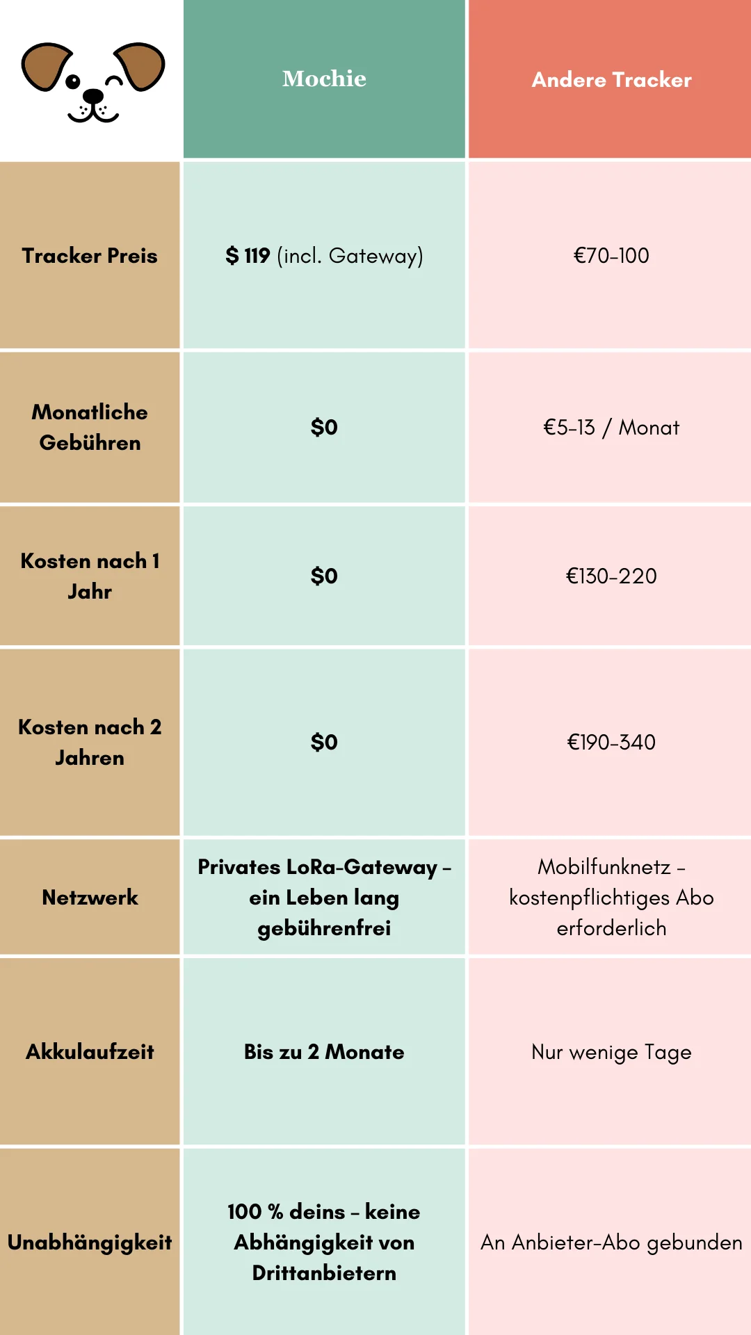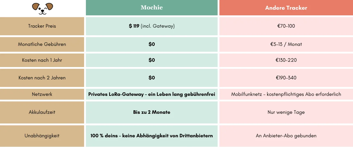 Keine monatlichen Gebühren bedeutet mehr Leckerlis für mich! Mochie hält mich sicher – und meine Eltern glücklich. Win-win!